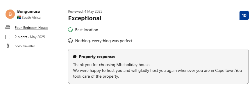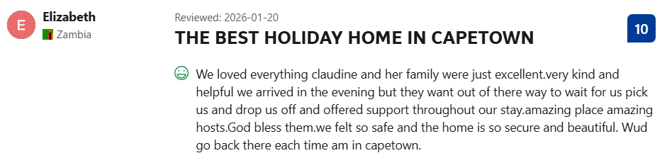 The house is beautifully decorated and had enough space for everyone. It was perfectly situated to get to Cape Town for work. Everyone loved their stay.